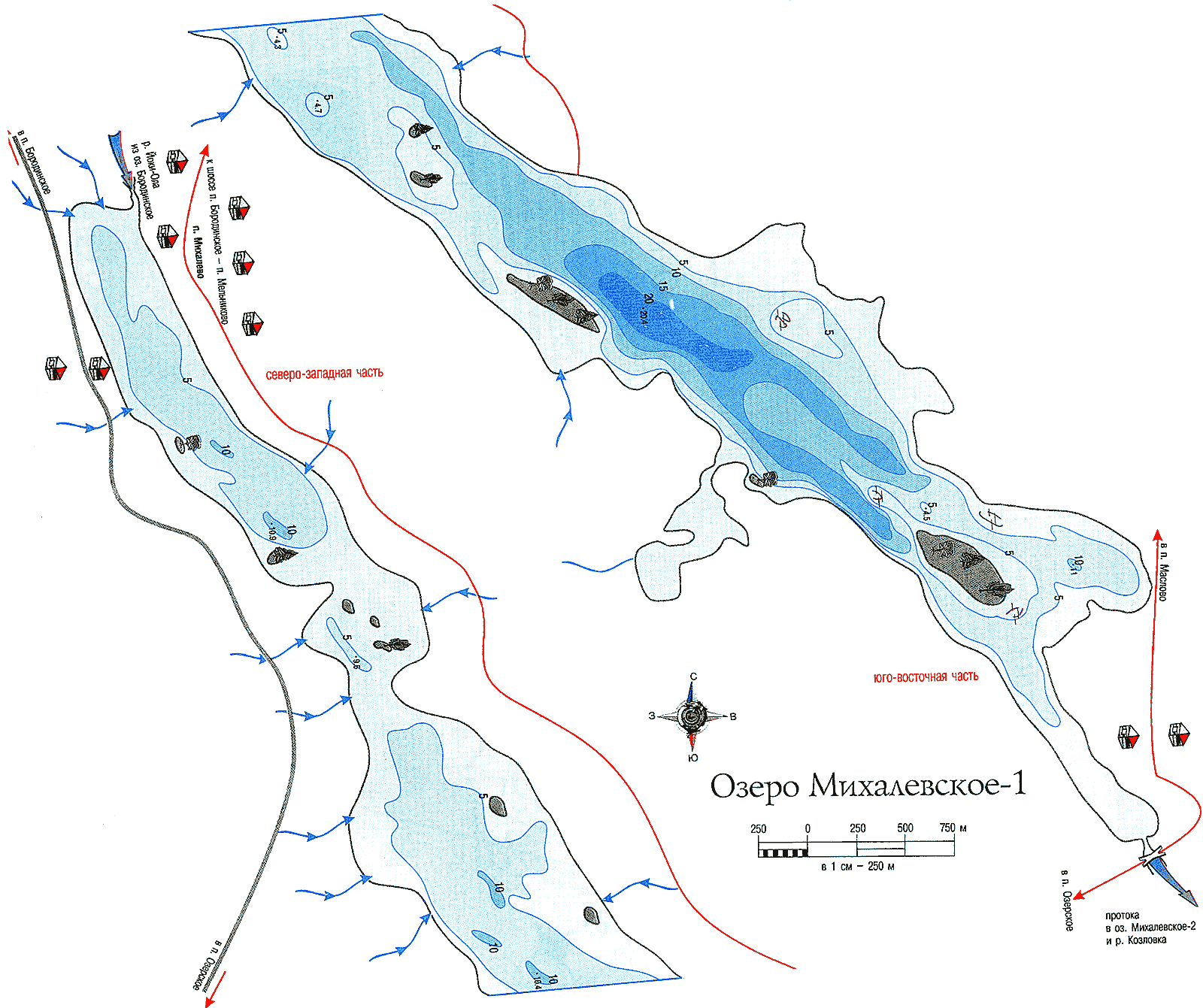 Бородинское, ширина до 30 м, глубина до 3 м,